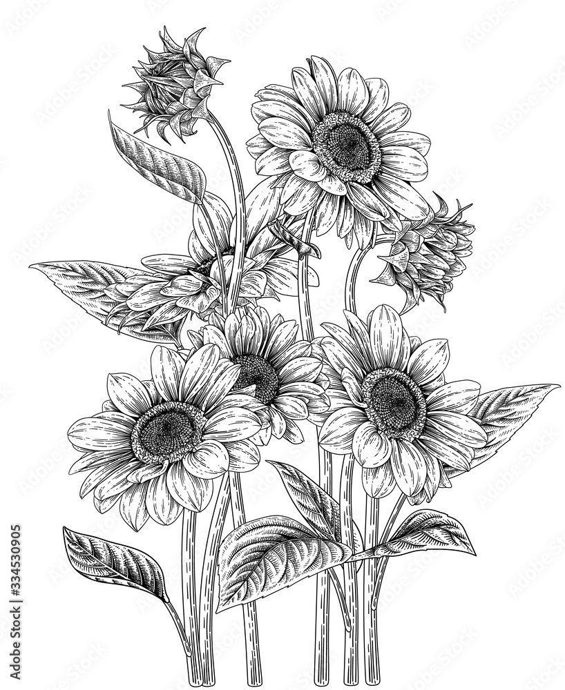 Sketch Floral Decorative Set Sunflower Drawings Black And White With Line Art Isolated On White Backgrounds Hand Drawn Botanical Illustrations Elements Vector Wall Mural B Illustrations